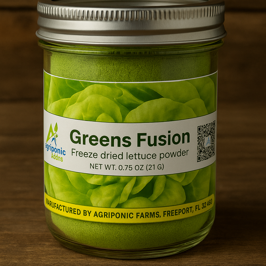 Experience the next evolution in nutrition with Greens Fusion, a premium freeze-dried greens powder grown in our cutting-edge AgriPods. Every scoop captures the crisp, clean flavor and nutrient density of hydroponically grown lettuce and microgreens—harvested at peak freshness and gently freeze-dried to preserve 99% of their vitamins, minerals, and natural enzymes.