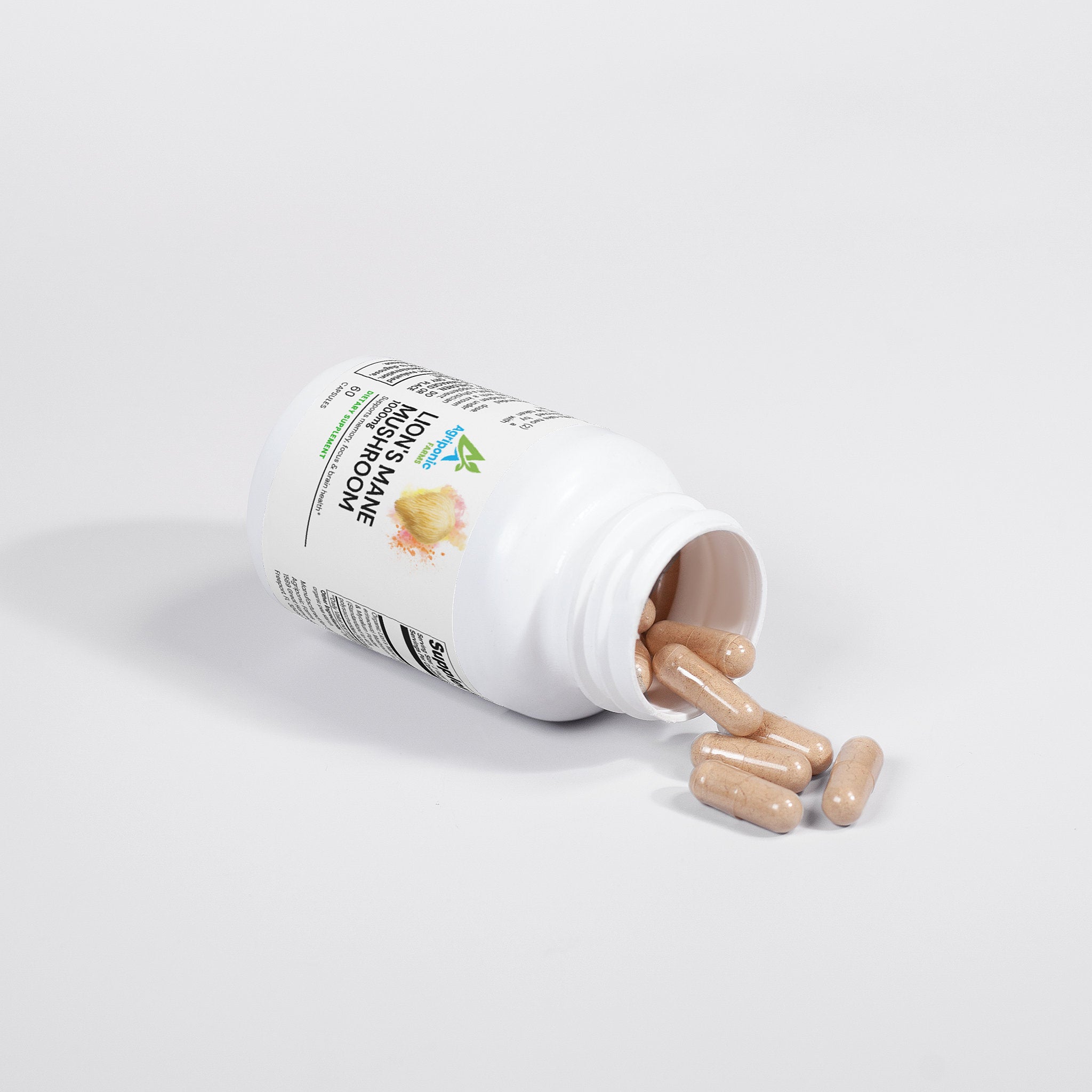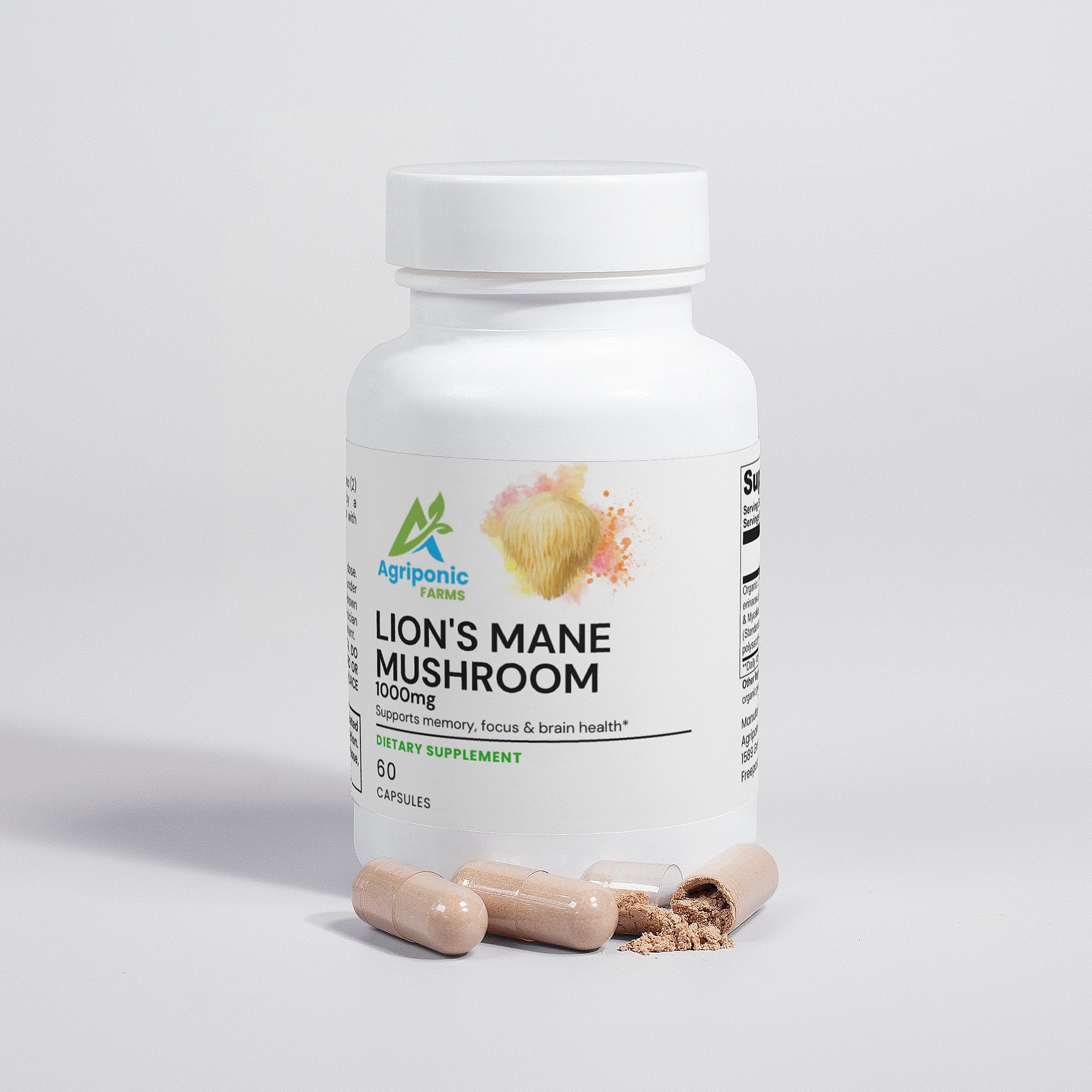 Ingredients: Organic Lion’s Mane (Hericum erinaceus) Mushroom Fruiting Body & Mycelium Powder (Standardized to 40% polysaccharides [400mg]), Organic capsule (pullulan, water), organic pea starch.